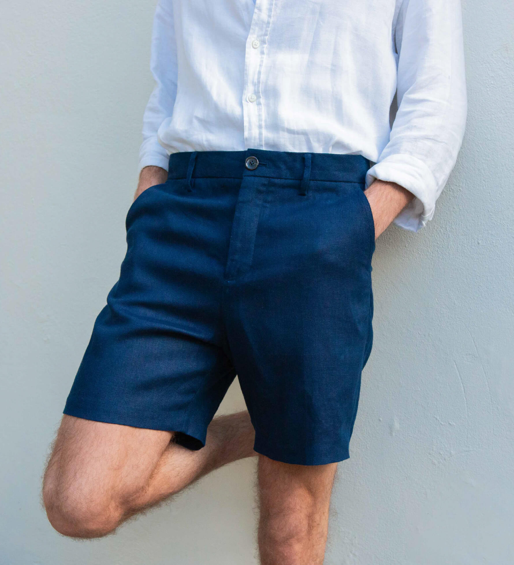 Navy blue hemp shorts with a white shirt worn by a person with his hand in his pocket
