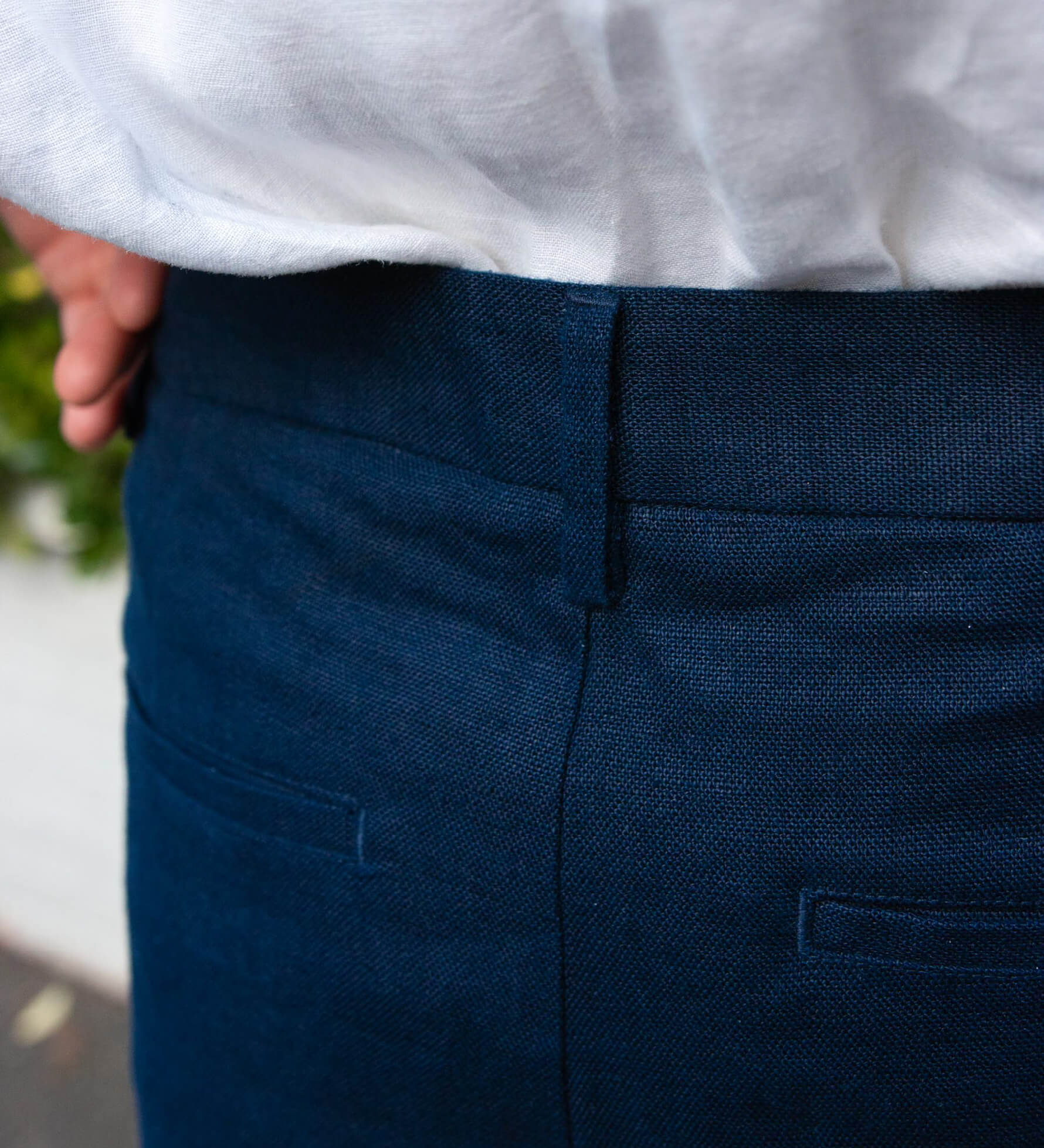Close-up of a person wearing navy blue shorts from behind showing the pockets on the back in detail and a light-coloured shirt.