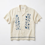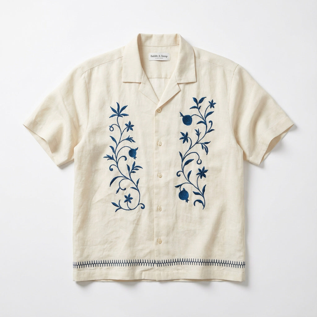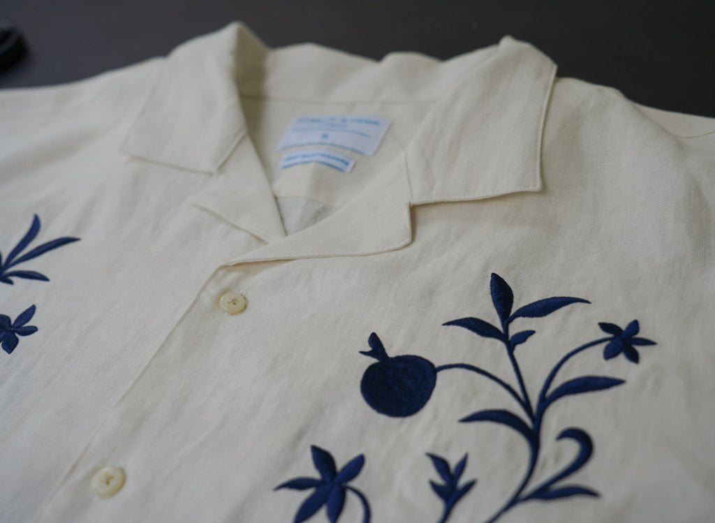 A cream hemp Cuban shirt finished with navy blue floral embroidery. Cut for warm afternoons and long evenings, El Jardín celebrates patience, craft, and the idea that the best things grow slowly.