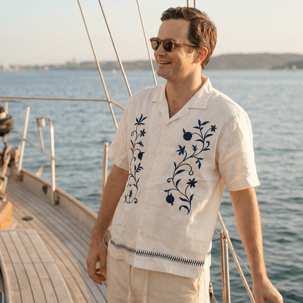 a photo of a man wearing a smart casual, camp collared hemp shirt made from cream or off white coloured hemp fabric with floral embroidery whilst standing on a yacht