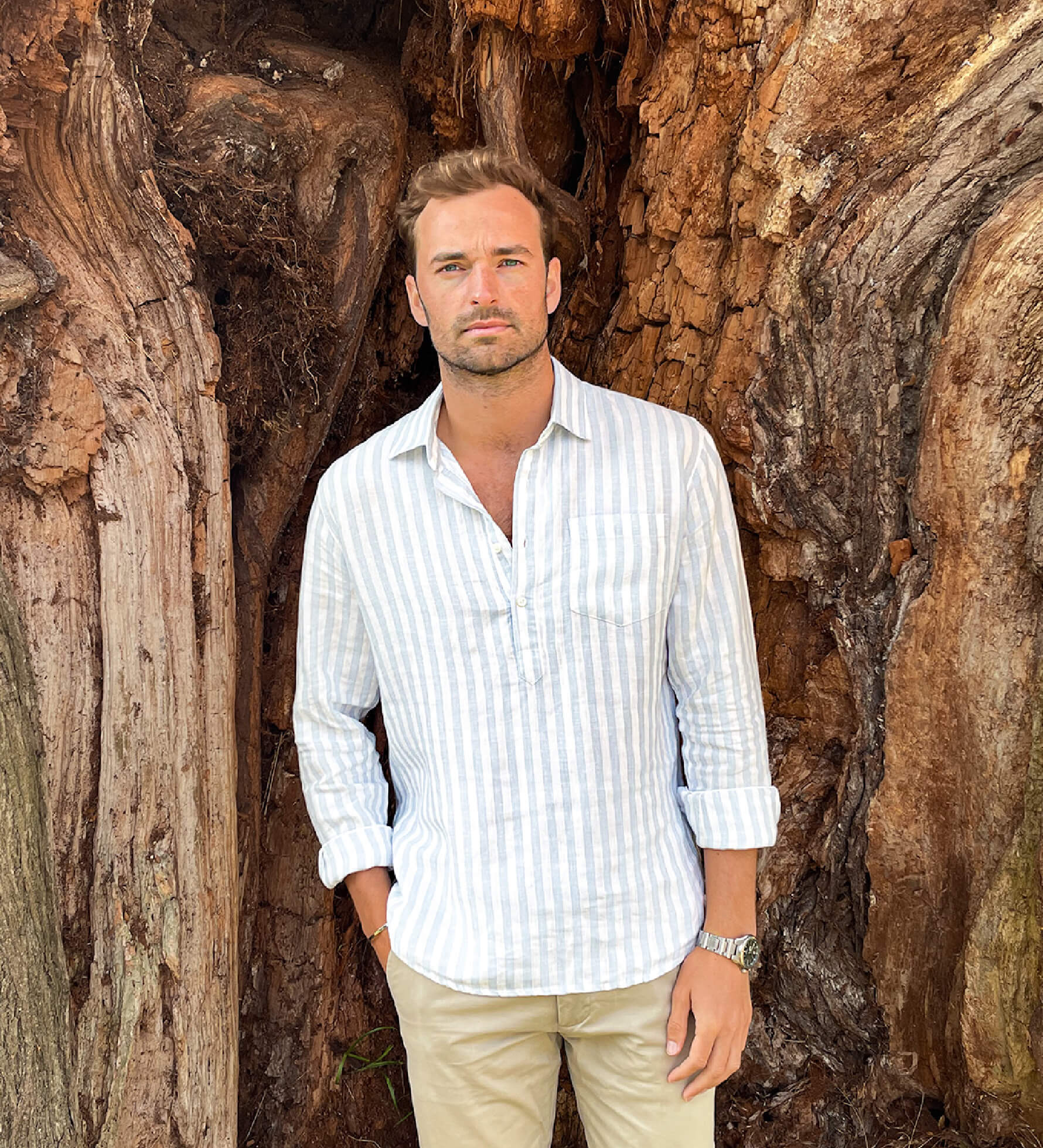 Man in a light blue striped shirt and white pants standing under a tree in a natural setting