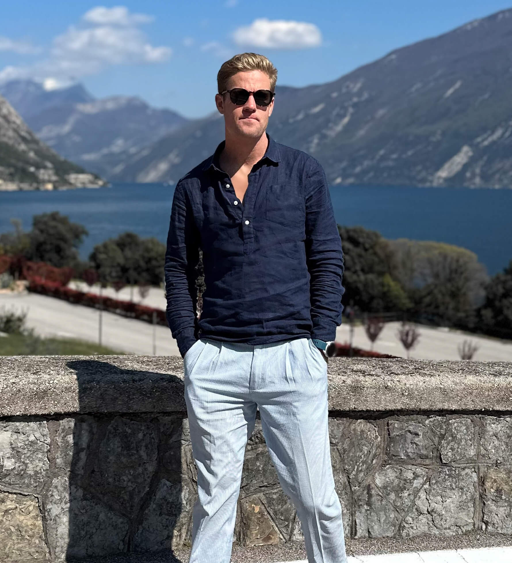 Man in sunglasses and a navy blue hemp shirt standing against a scenic backdrop of mountains and water.