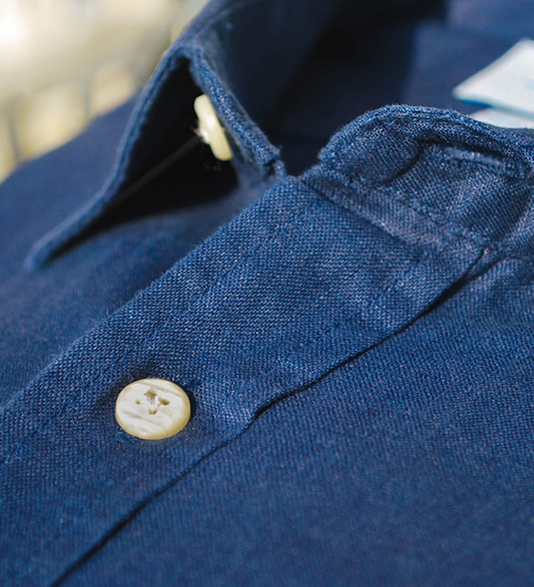 Close-up of a blue shirt showing the detail and soft texture of hemp fabric with buttons on a blurred background