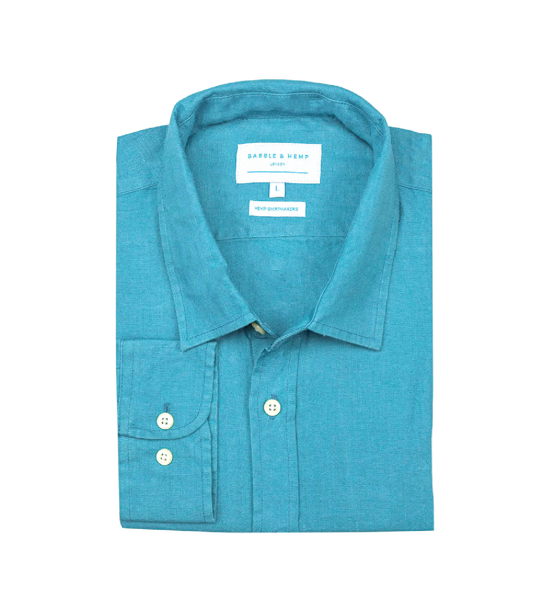 Folded turquoise hemp shirt with a visible brand label on a white background