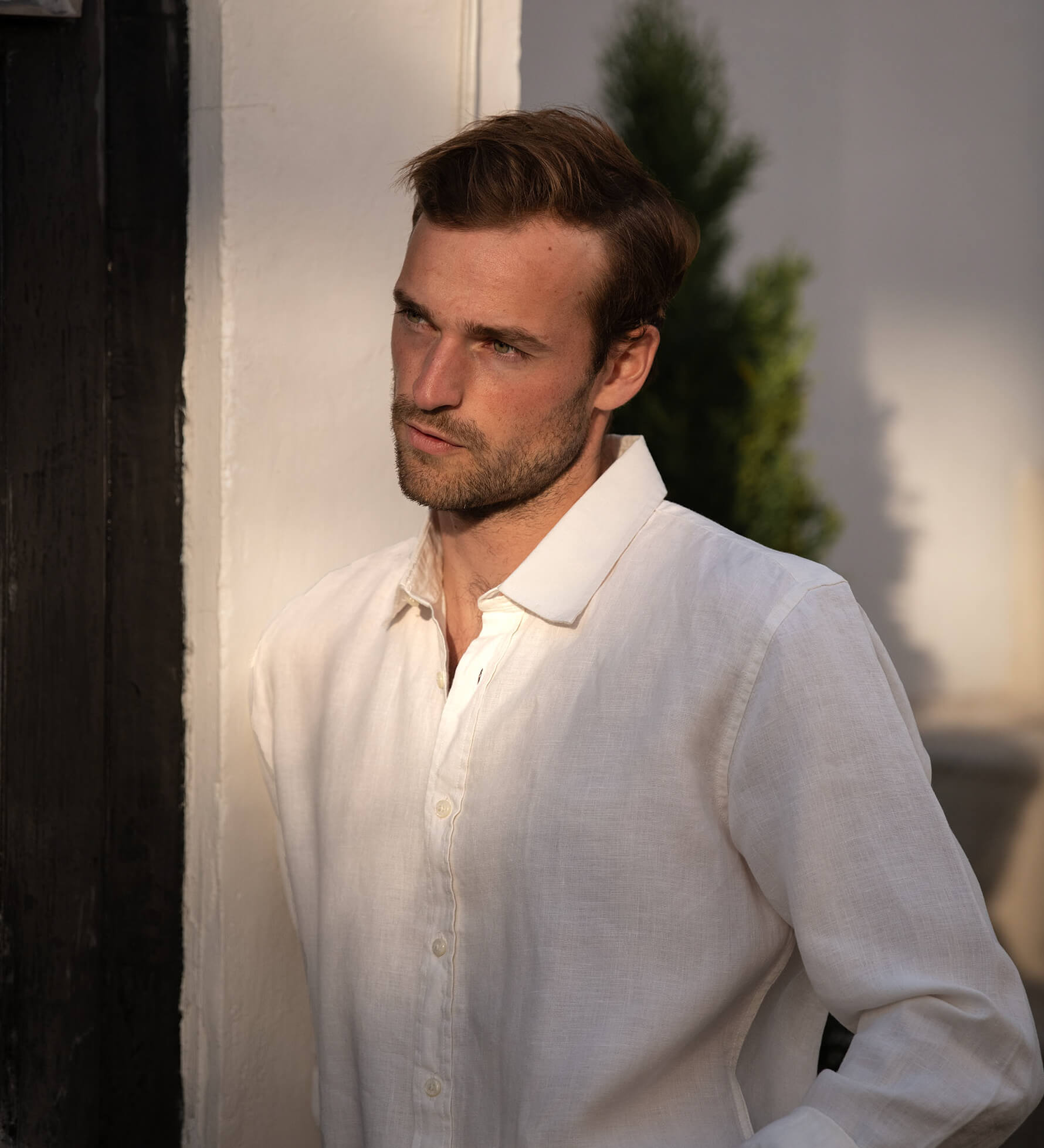 Man wearing a white hemp shirt leaning against a wall with a plant in the background