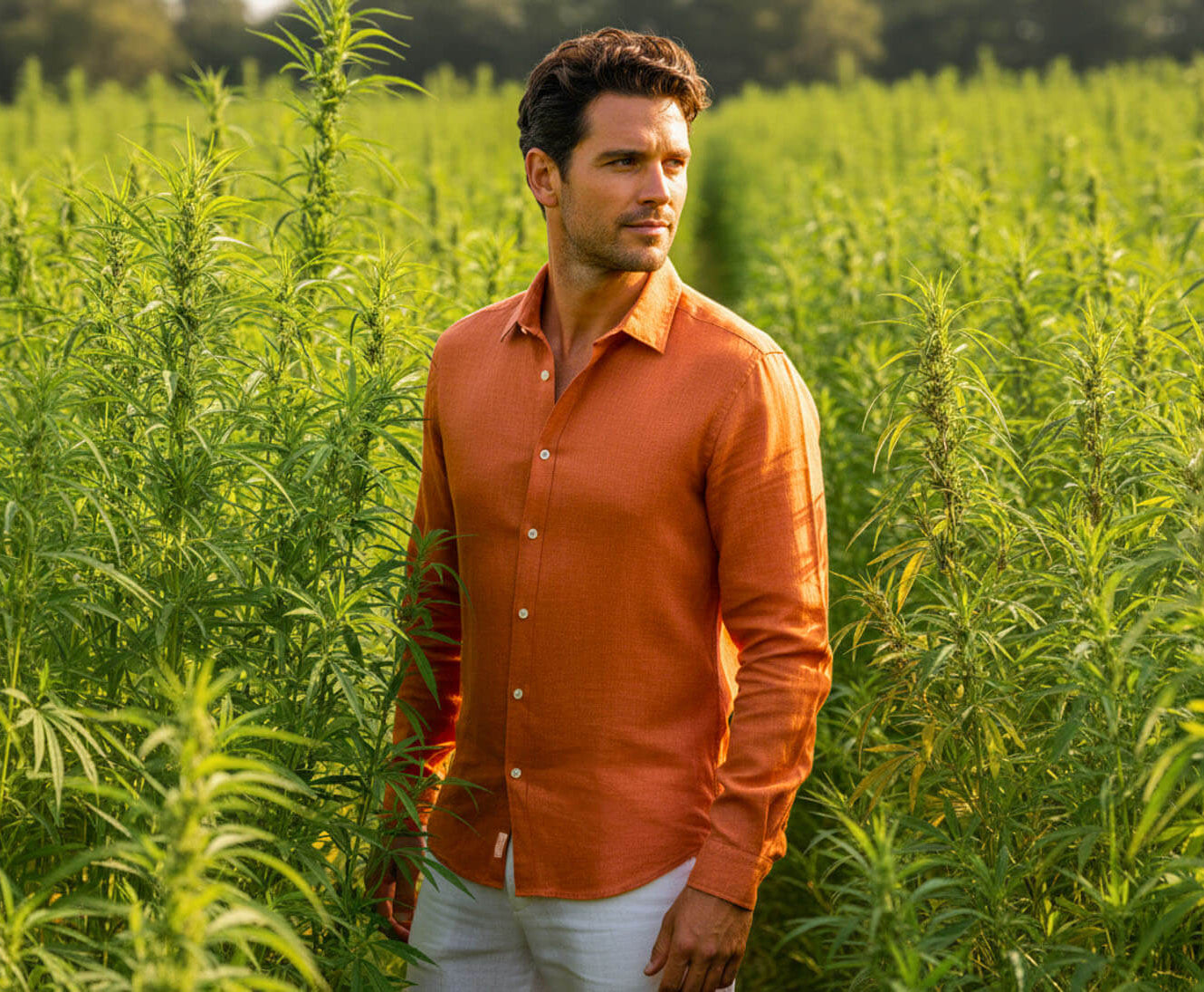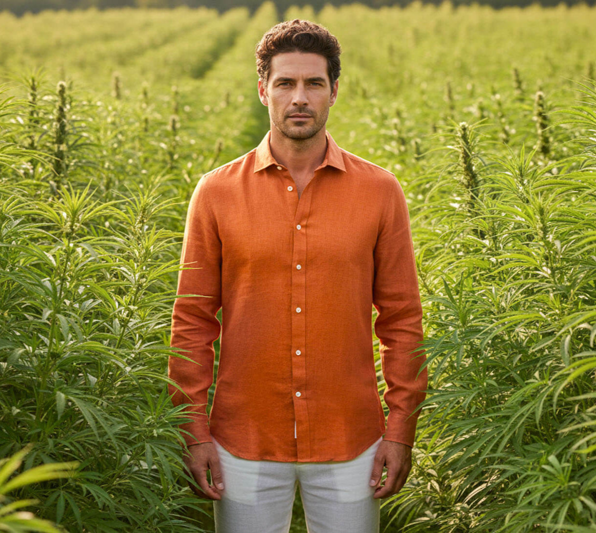 Man holding a plant in a field of greenery wearing a terracotta coloured hemp shirt
